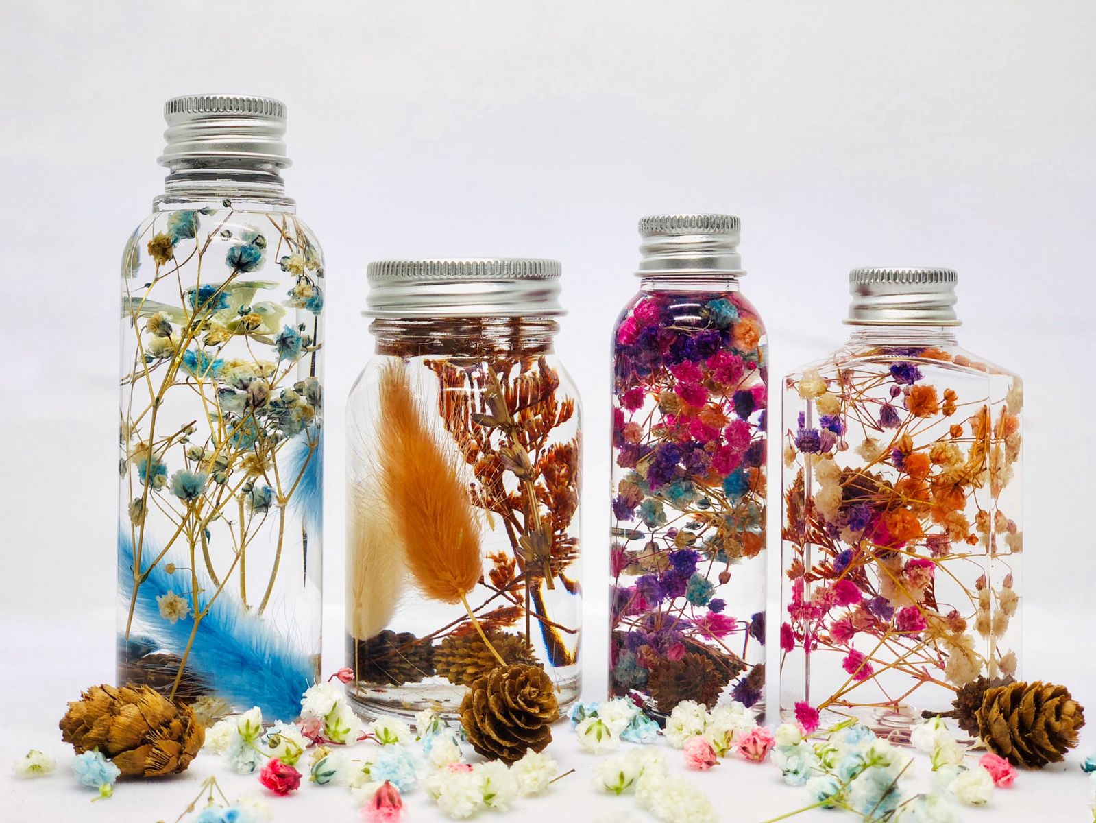 教學說明:挑選並修剪乾燥花材後,放入充滿礦物油的瓶內,保留著盛放花朵的美態,讓花朵看起來就像是浮游在水中一樣。